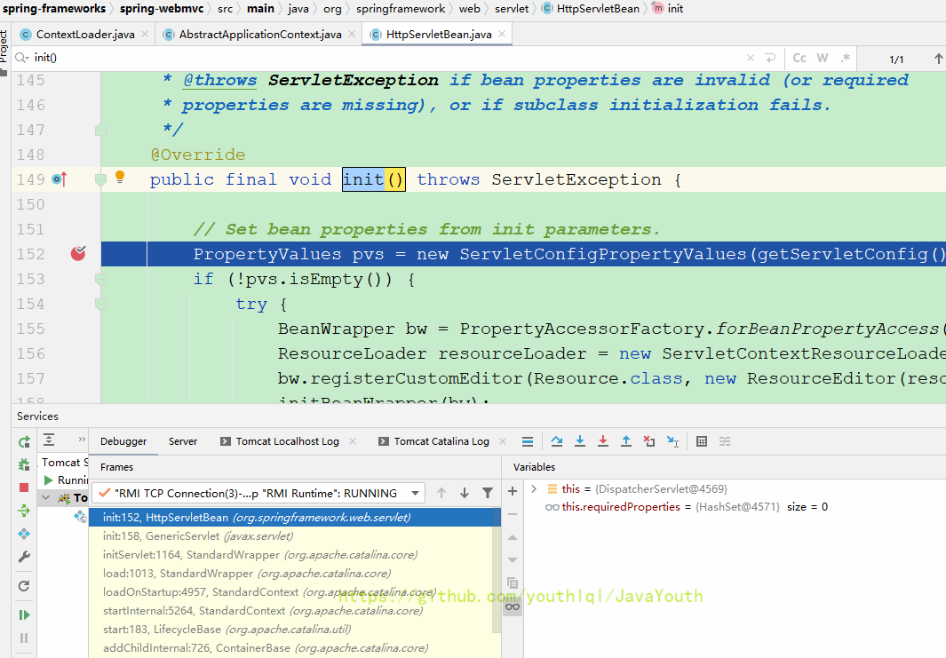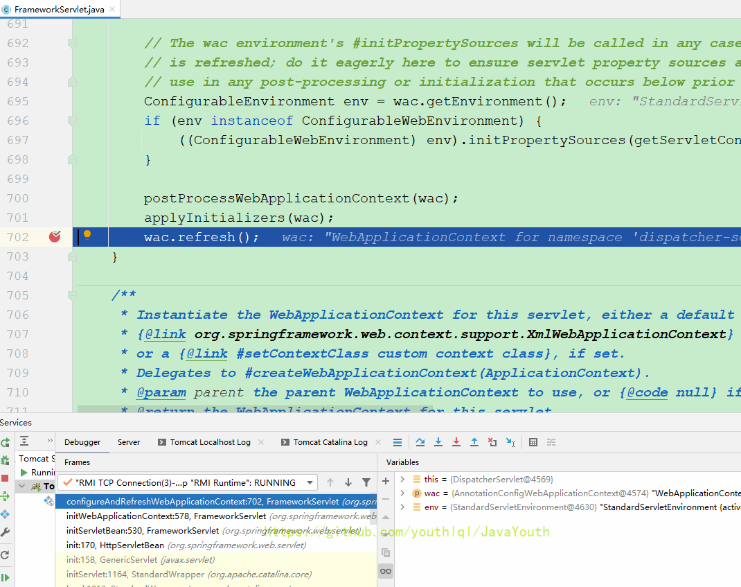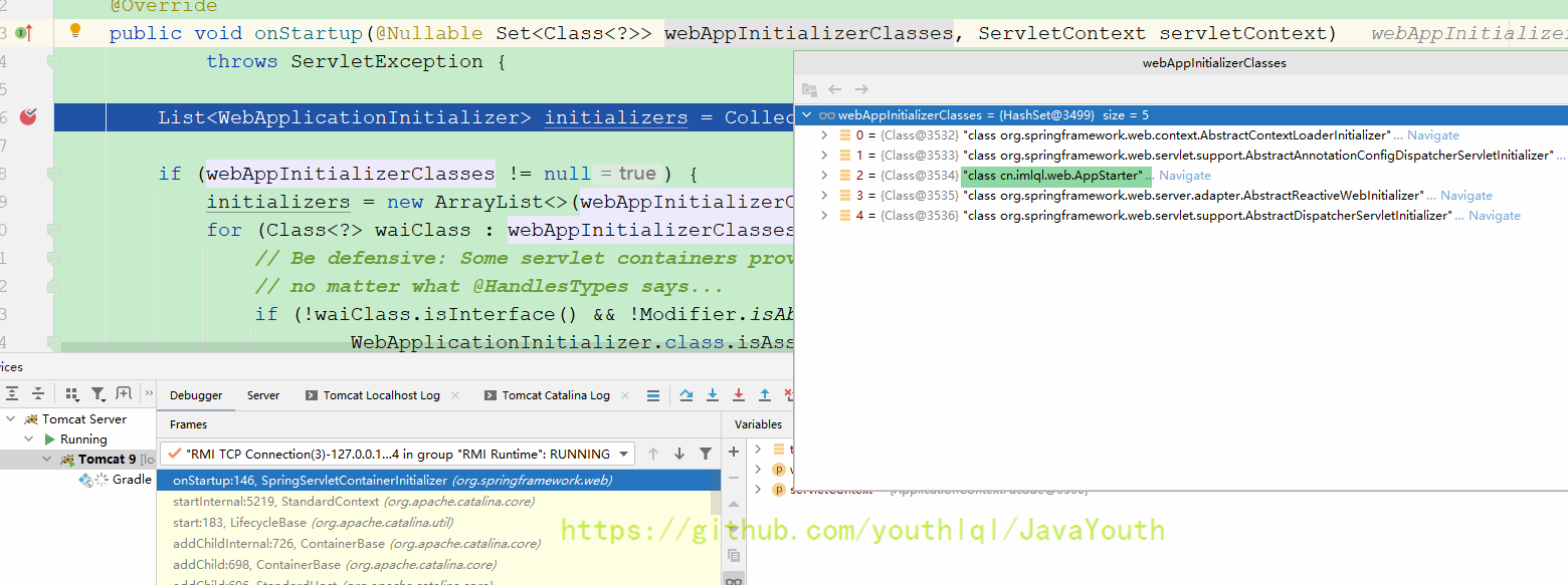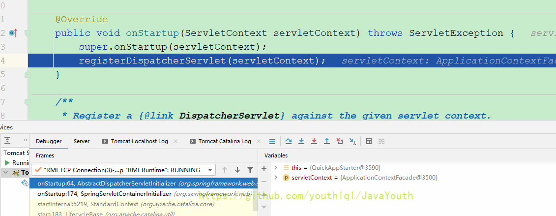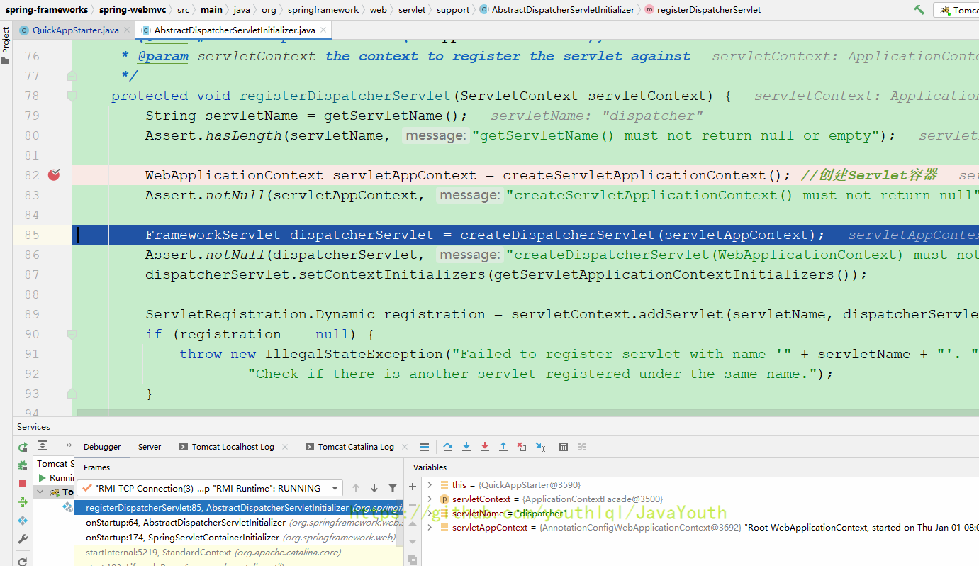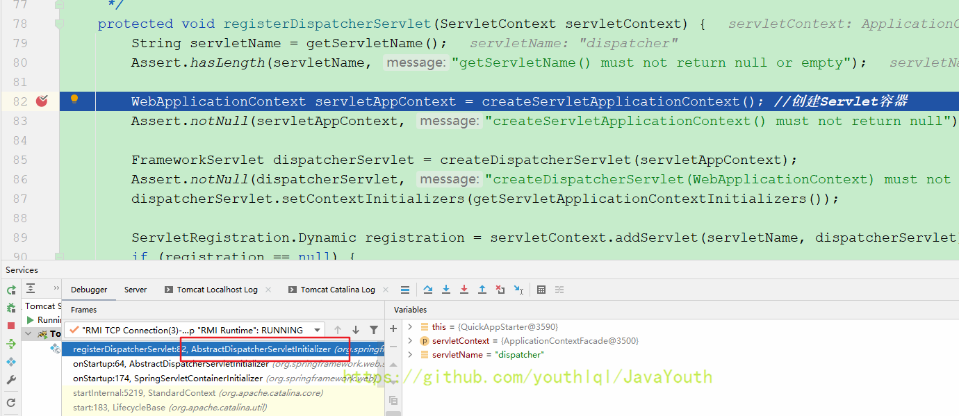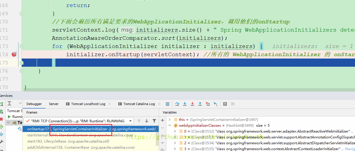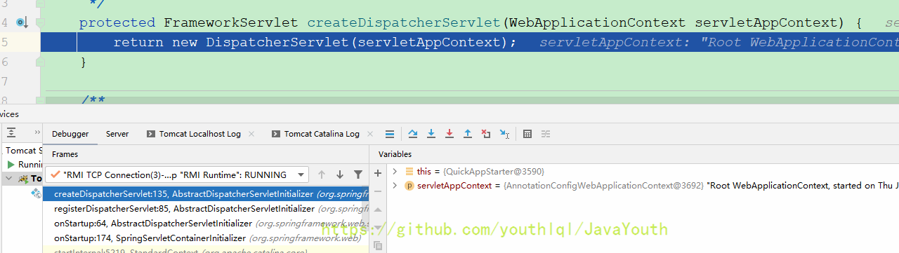 跳到了这里为什么会跳到这里呢记不记得之前我们用DispatcherServlet保存了Web子容器这里就要调用DispatcherServlet的相关初始化方法