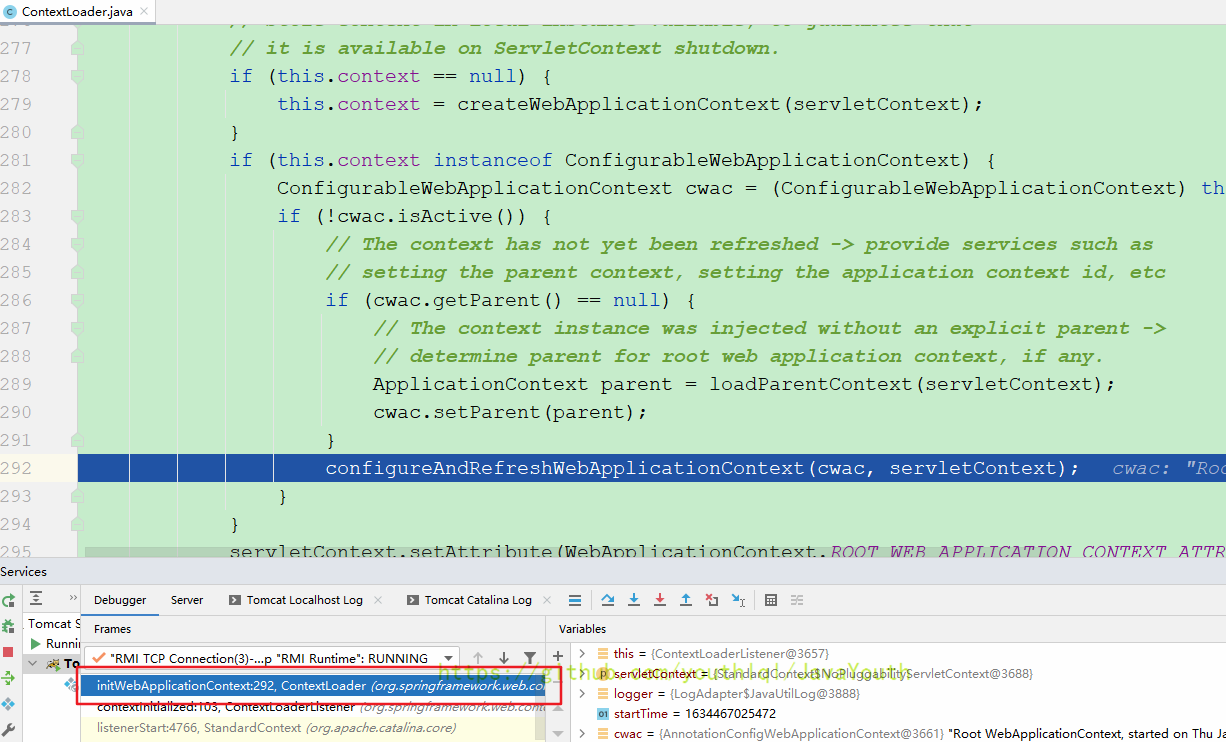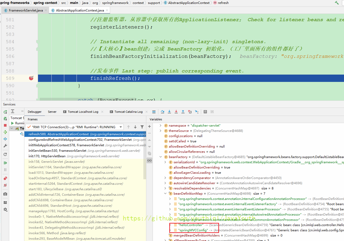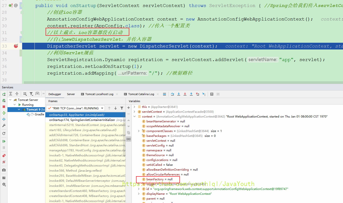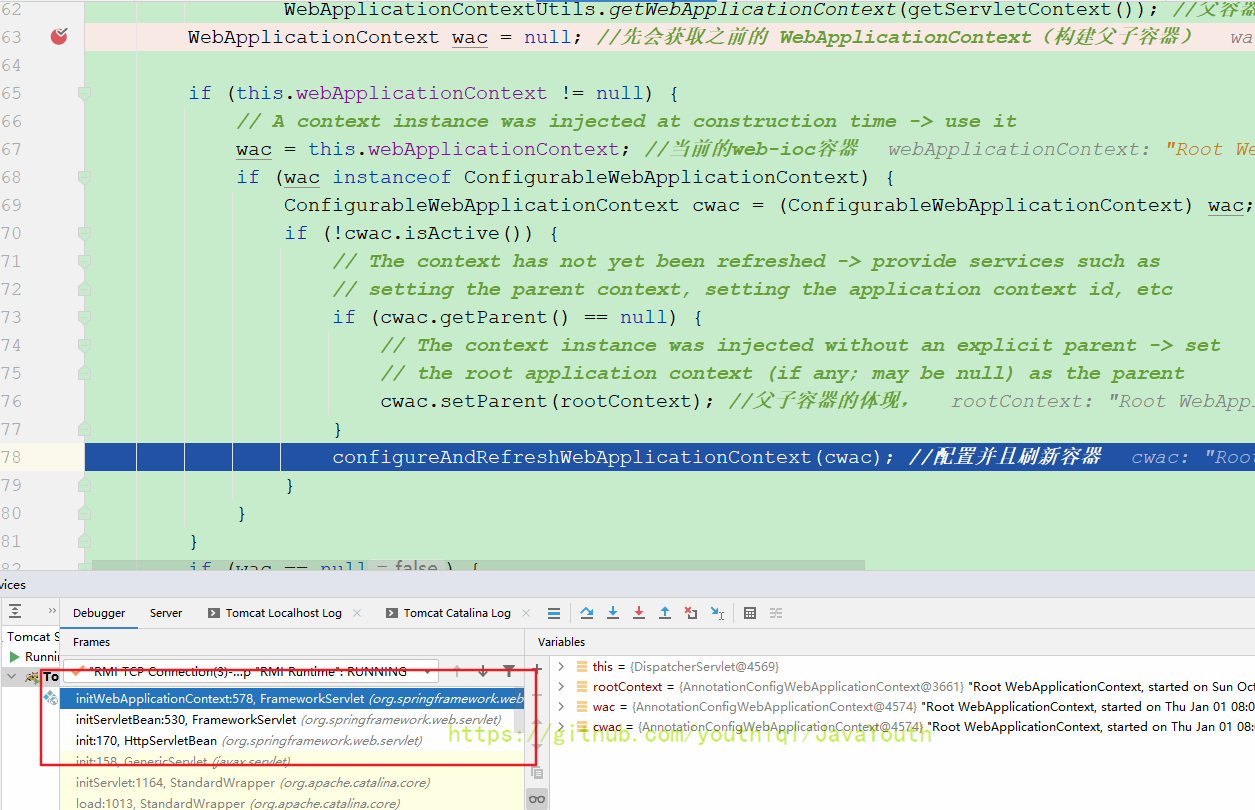 2. 你往前看看咱们的Spring容器和Web子容器都是只是创建完了都还没有初始化甚至都没有webloc.setParent(springloc)这样产生父子容器的关系