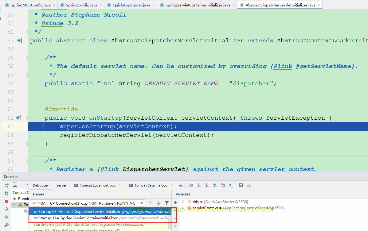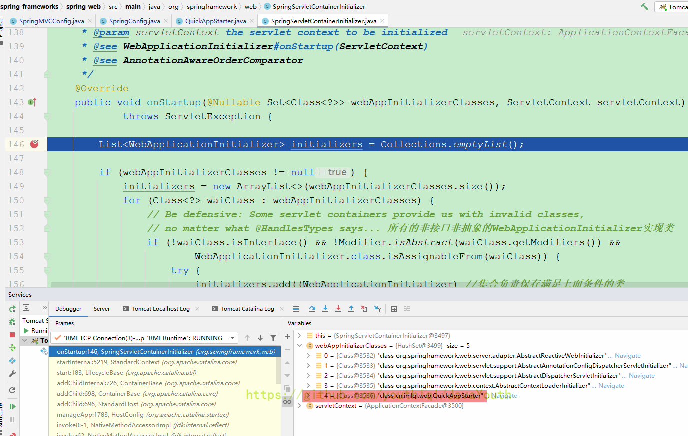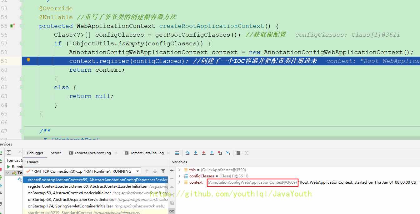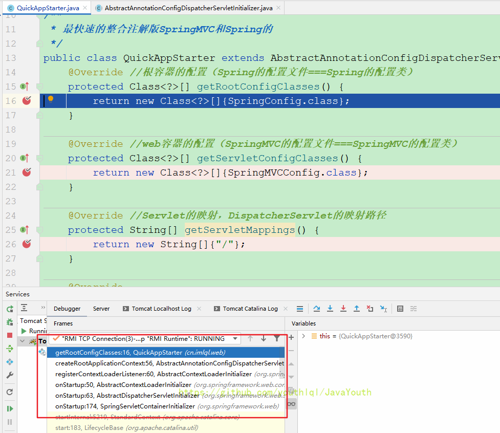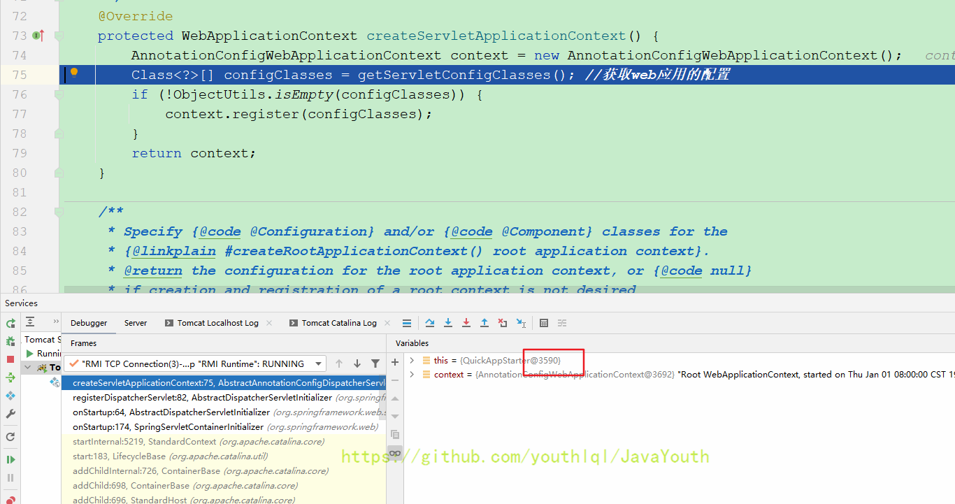 这里又new了一个容器和上面那个容器一样都没有初始化。这里也是调用咱们QuickAppStarter重写的方法因为这里调用的是getServletConfigClasses()所以很明显这里的容器是Web子容器