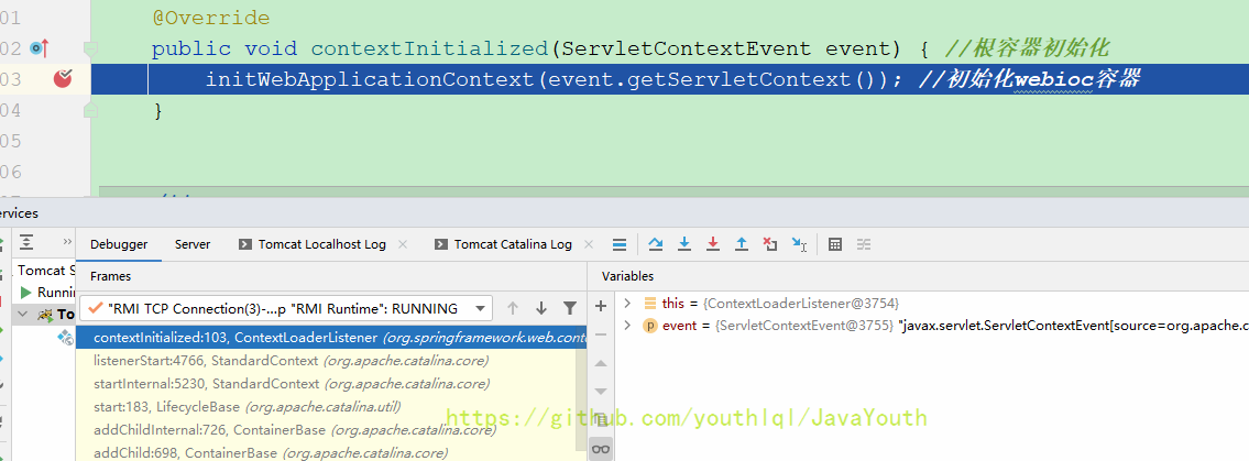 3. 回想下前面讲的,是不是有一个监听器,那你说把容器保存到监听器里,它能是干嘛的?猜想一下不就是应用加载完之后,发送一个什么事件,然后根据这个事件触发监听器初始化两大容器等等。