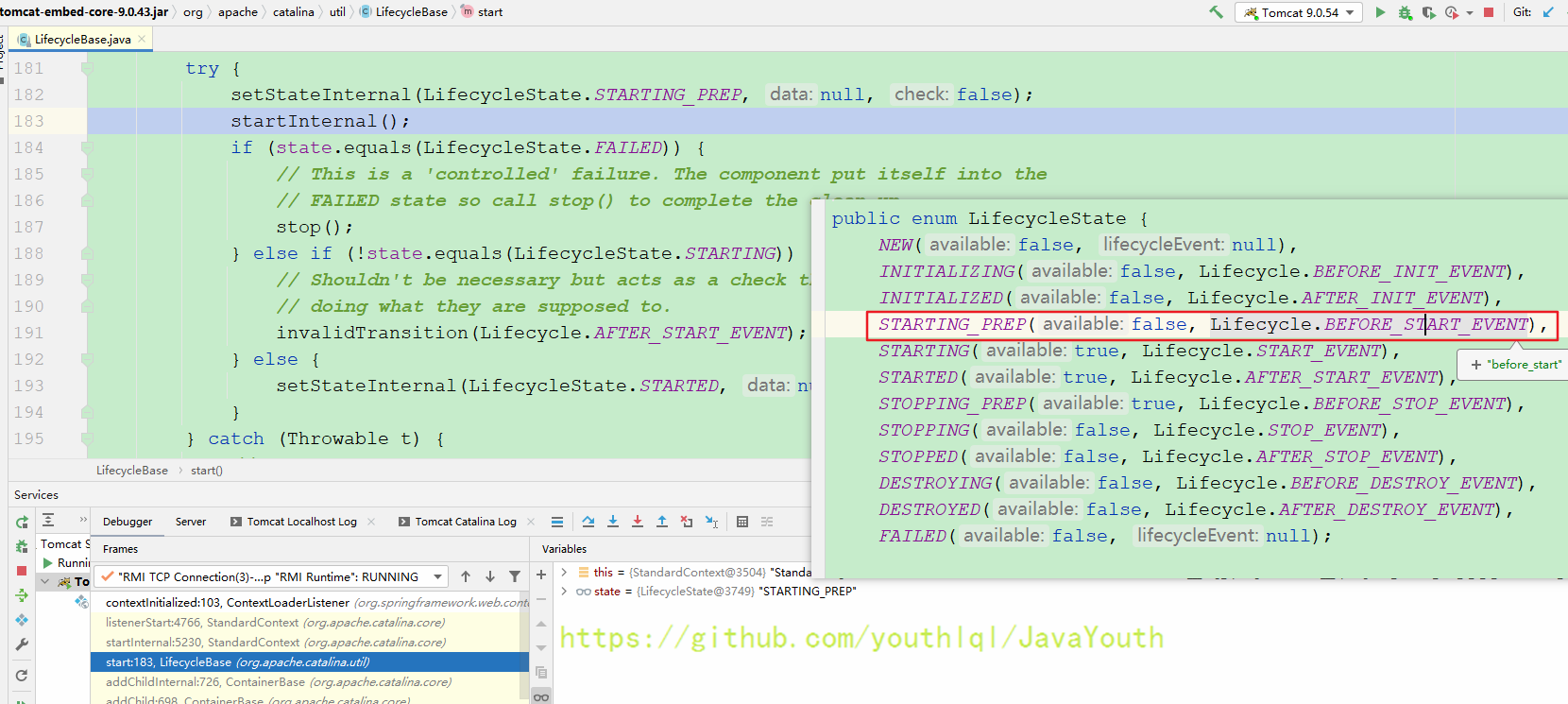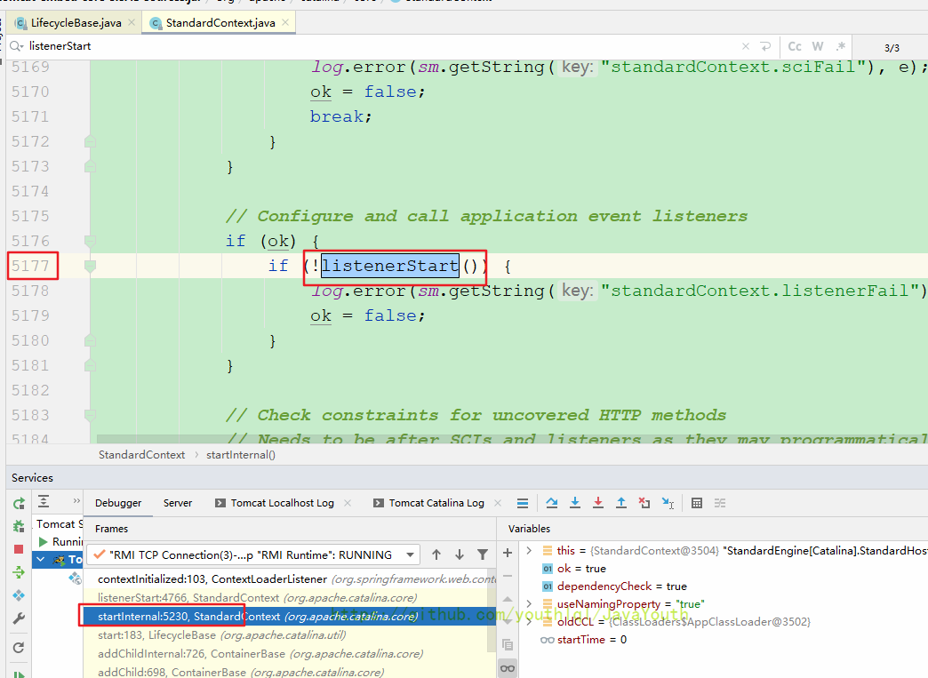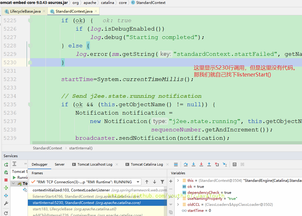 然后真的走到了这里。tomcat里的代码位置是乱的乱的意思就是比如说上面写的是4766行的调用但实际上那里是个}大括号。也不知道是什么问题所以我们就大致看下tomcat的代码不细究。