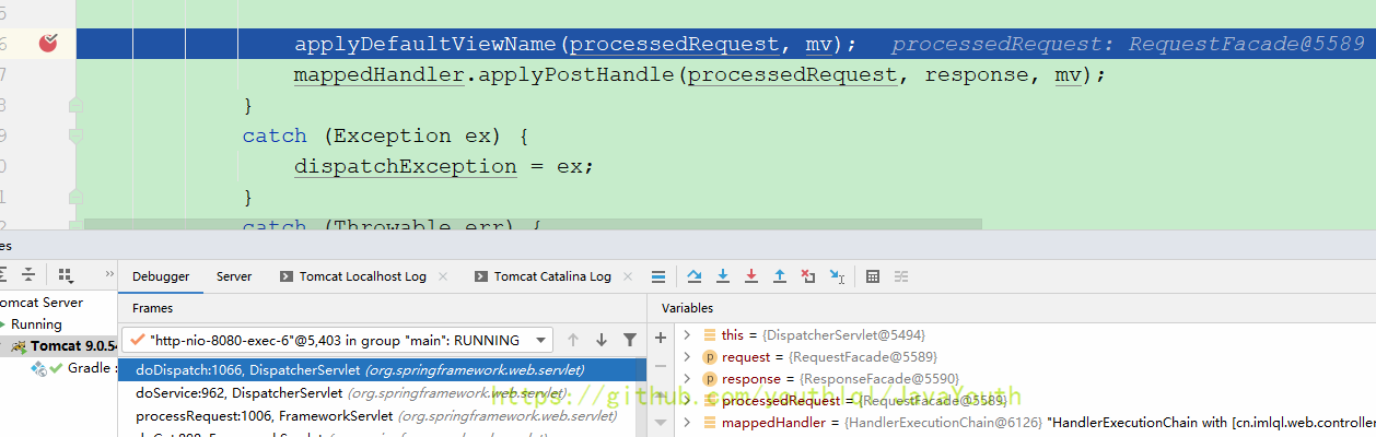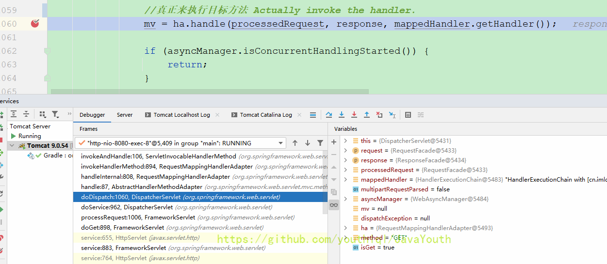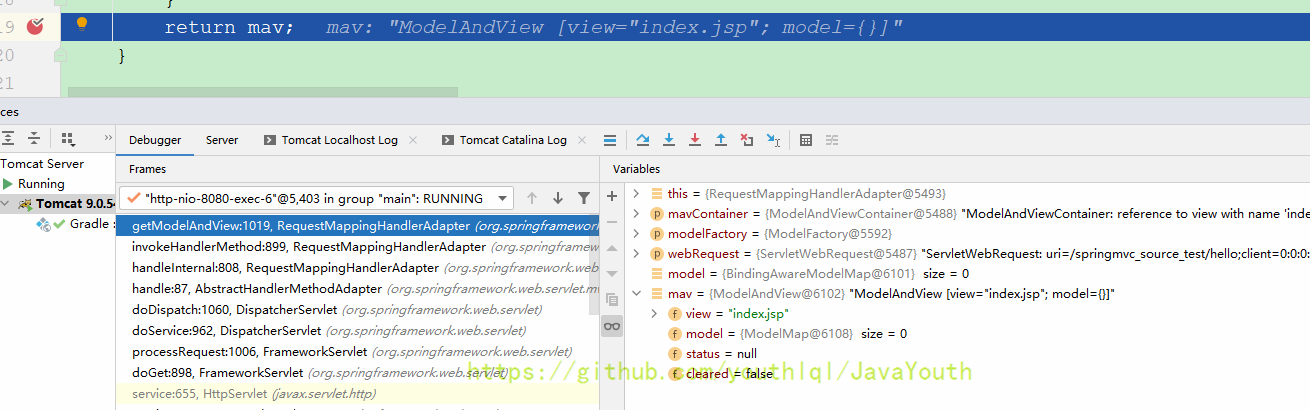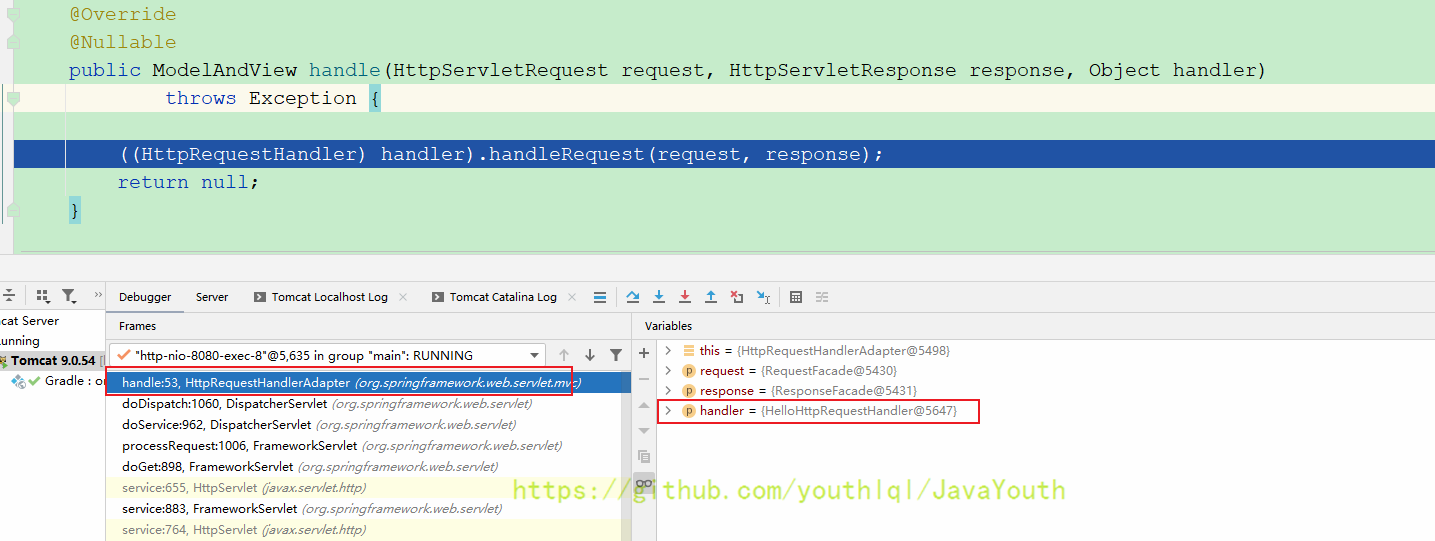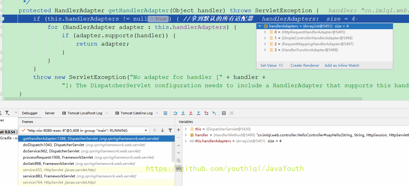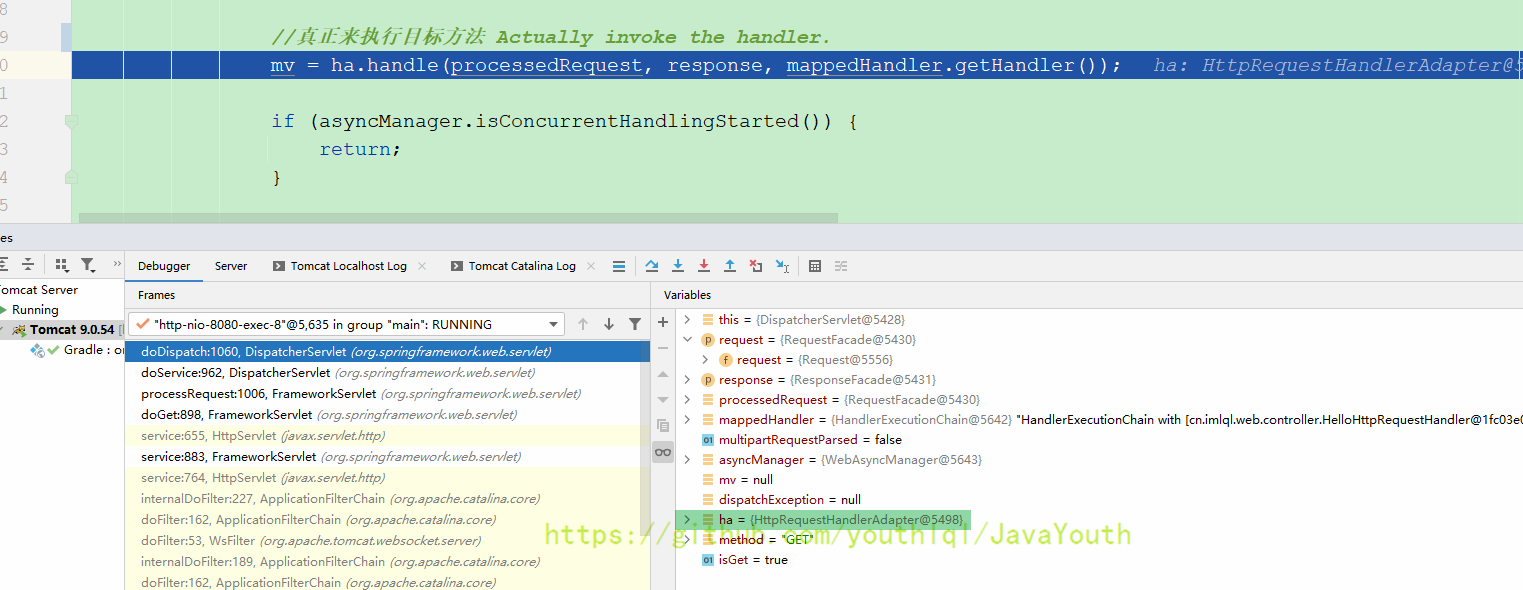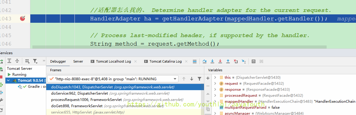 还是跟HandlerMapping一样继续Debug DispatcherServlet#doDispatch(HttpServletRequest, HttpServletResponse)