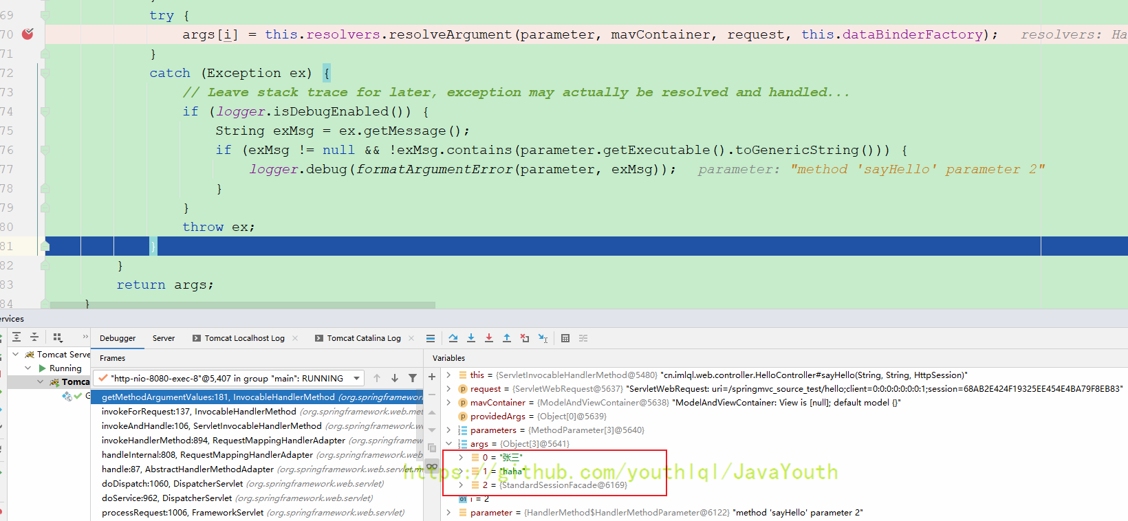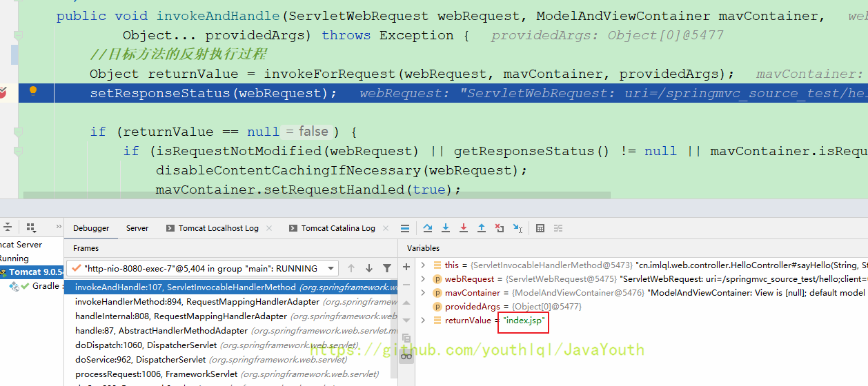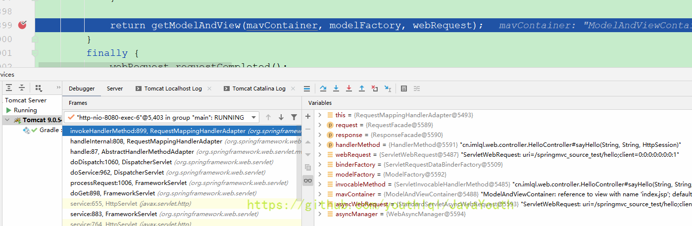 浏览器输入:http://localhost:8080/springmvc_source_test/hello?name=zhangsan&user=haha开始测试