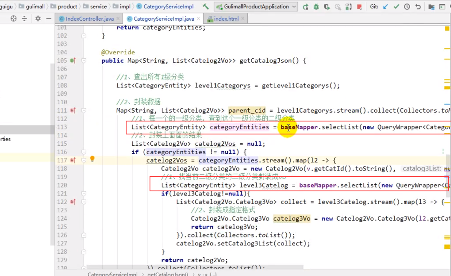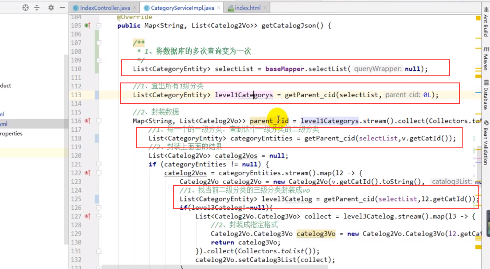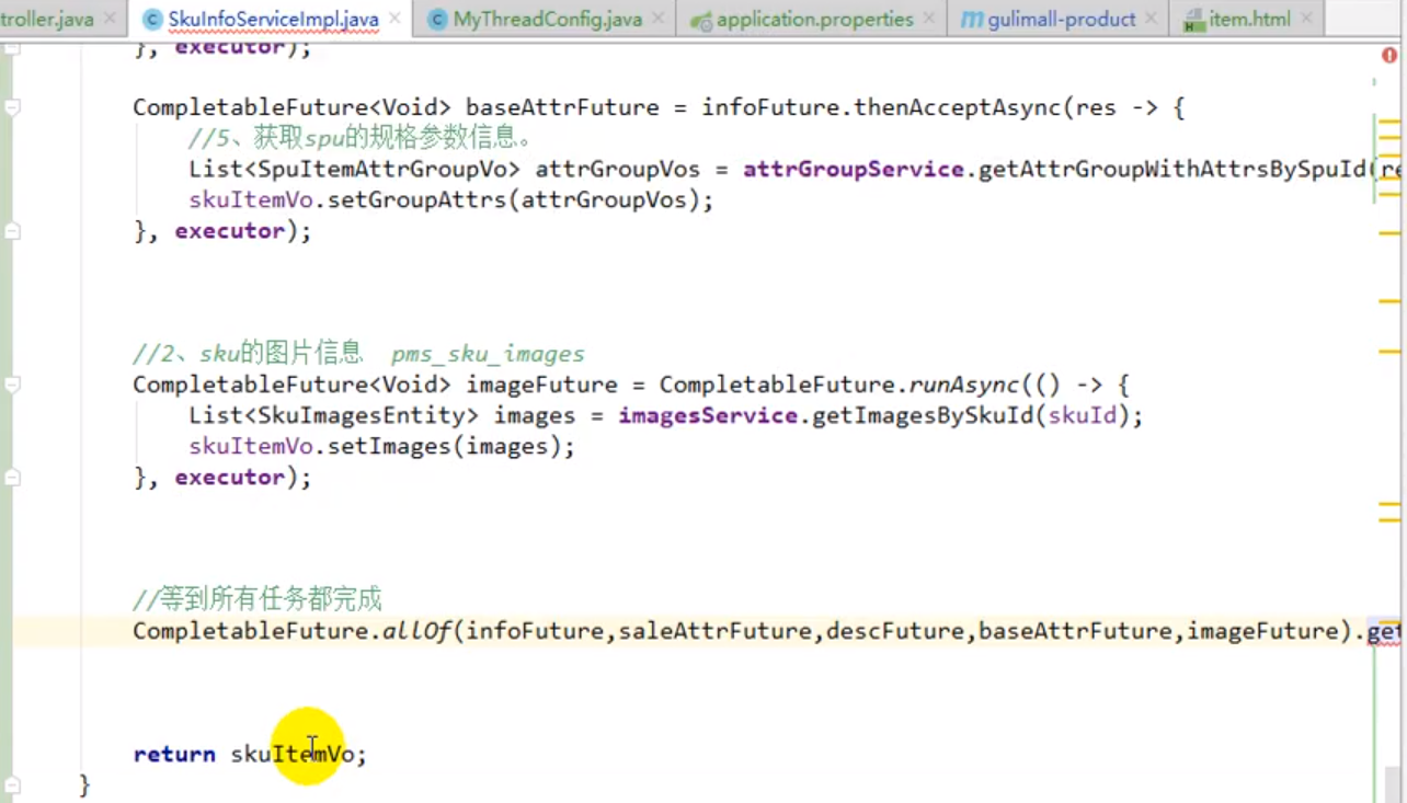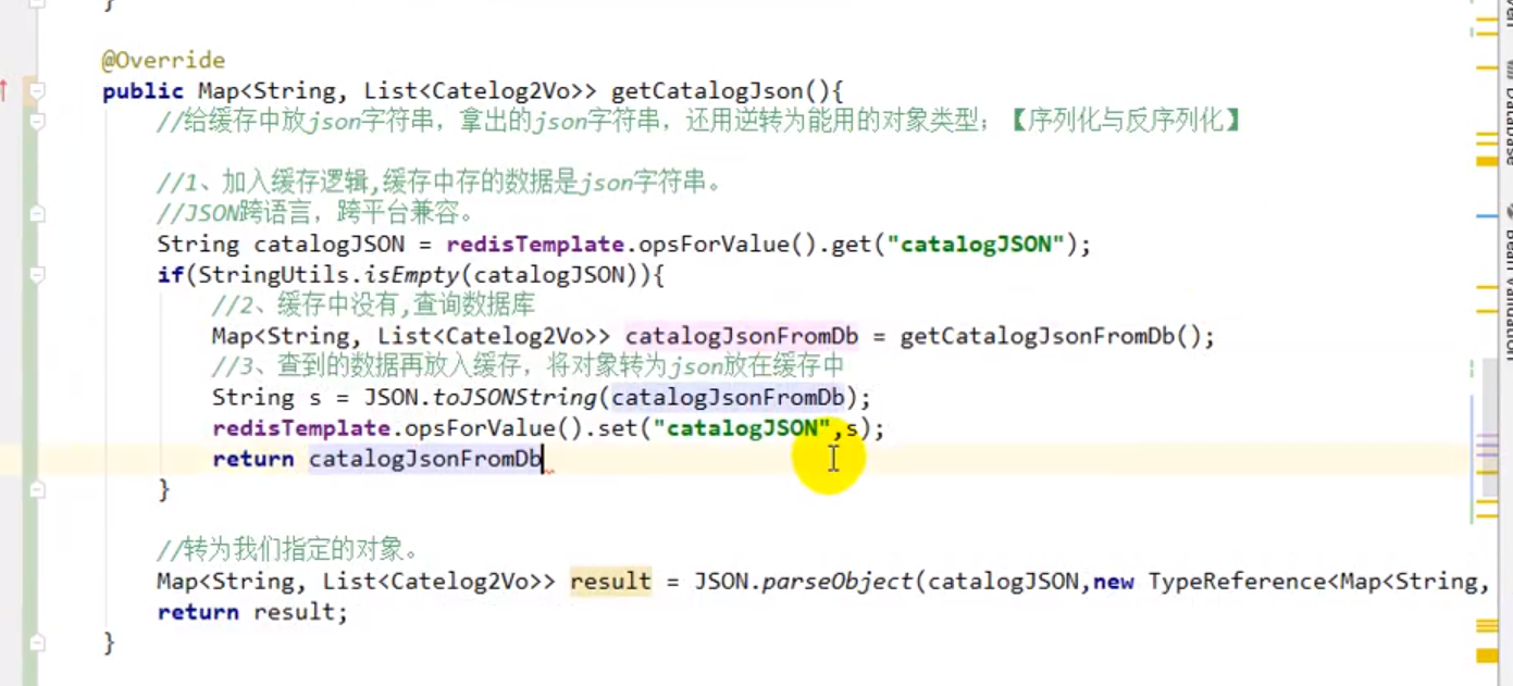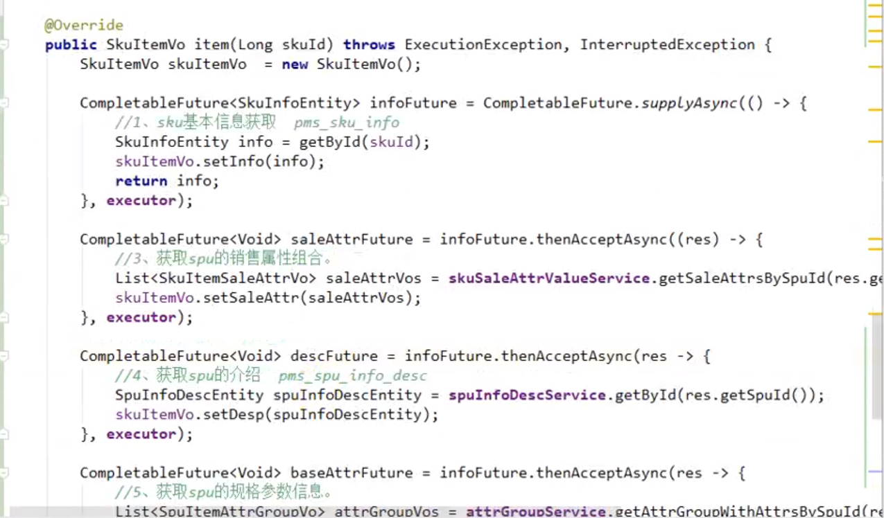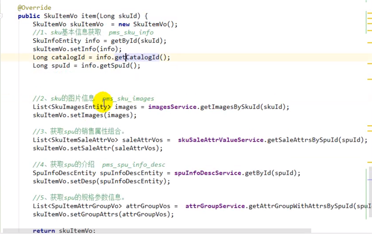 记录一下:视频里当时说的是可以用for循环,也可以通过一个sql语句来写。sql语句的写法在 "2019版-05 谷粒商品详情页.docx"