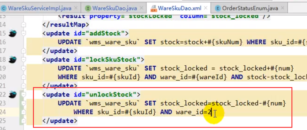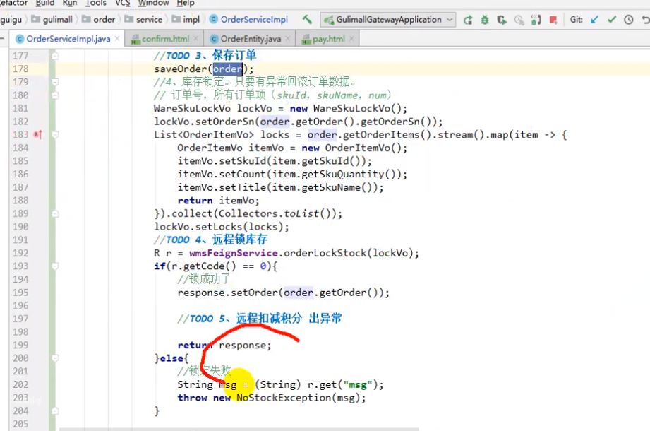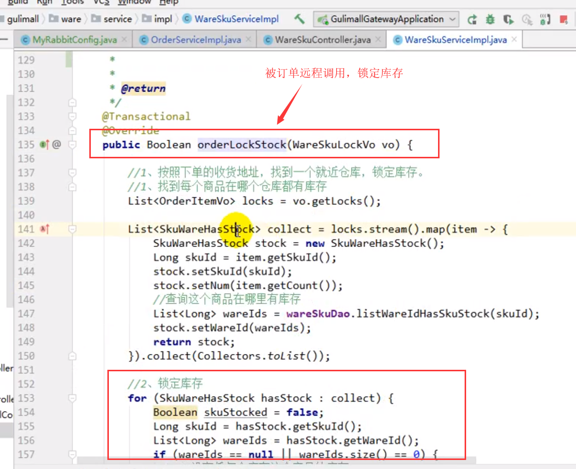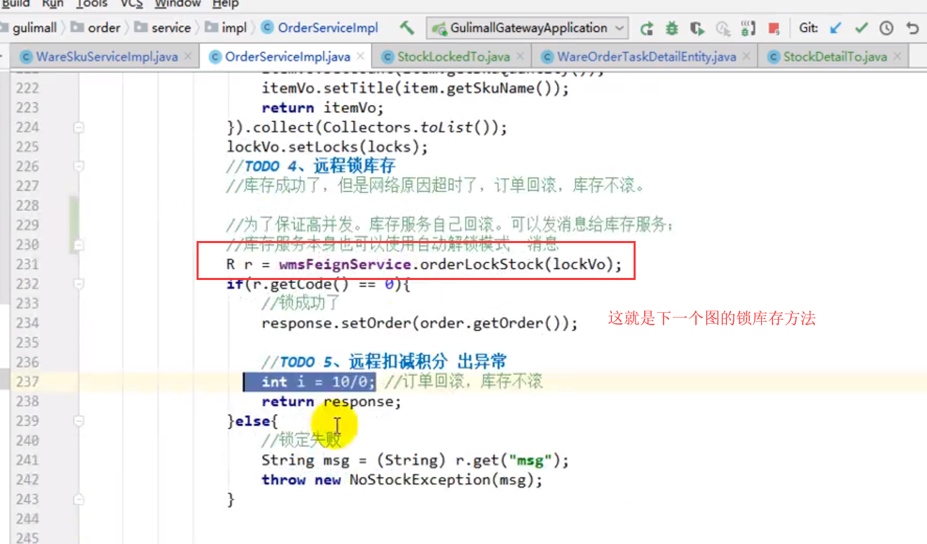 // 4. 库存锁定,只要有异常回滚订单数据
