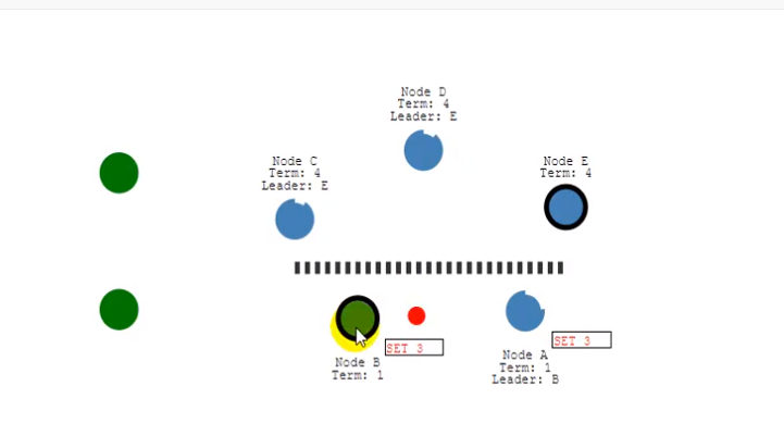 - 但是视频里讲的是下面的2个节点由于本来就有一个leader节点,所以还可以接受set 数据。但是由于得不到大多数节点的确认,还是保存不了数据,所以依旧给客户端返回是不可用的。但是这里我有个疑问,那如果只是读下面两个节点的数据呢?是否就可以读到呢?如果读到了岂不是就不可用了。所以视频讲的可能有一点点问题。以上面的第一个为准。
