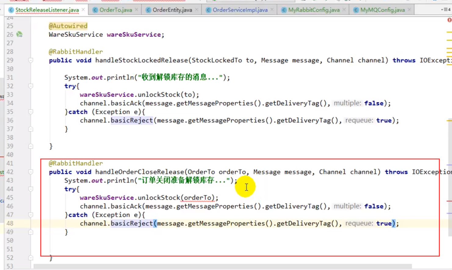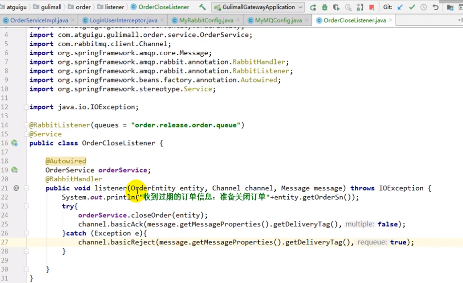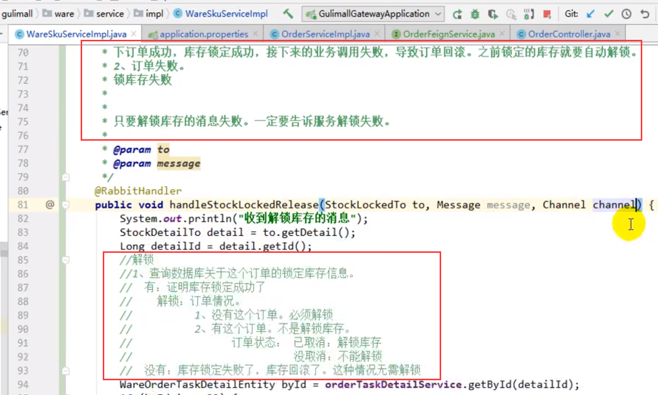 下面代码的第一个监听是为了解决锁定库存远程调用网络故障(实际已锁,但是网络原因返回错误,导致库存锁了,订单回滚了等这些问题)。同时也可以解决正常情况下用户30min未支付,关单并解锁库存的逻辑