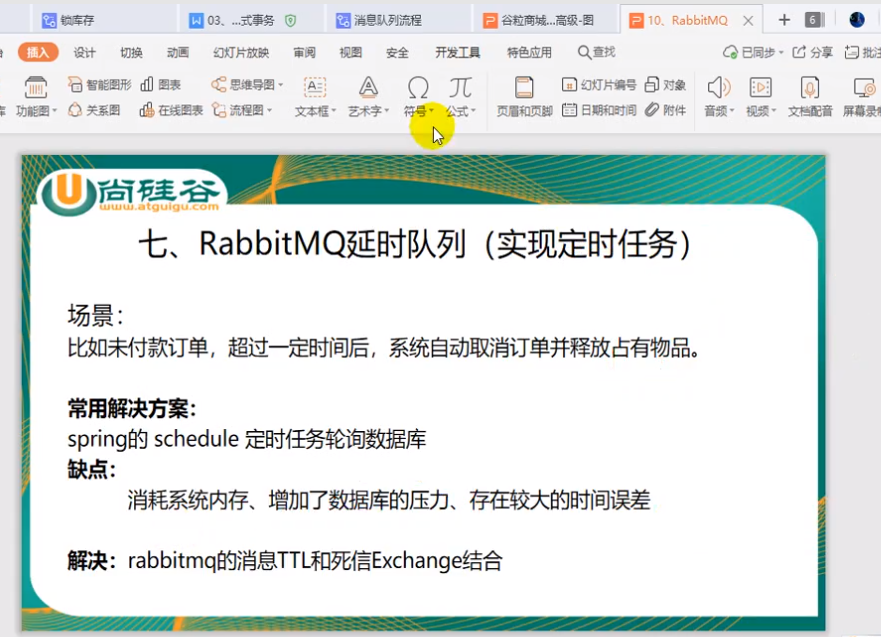 由于rabbitmq不支持定时发送消息,所以需要较为麻烦的方法来实现延时队列,可以看到视频中讲的比较麻烦。