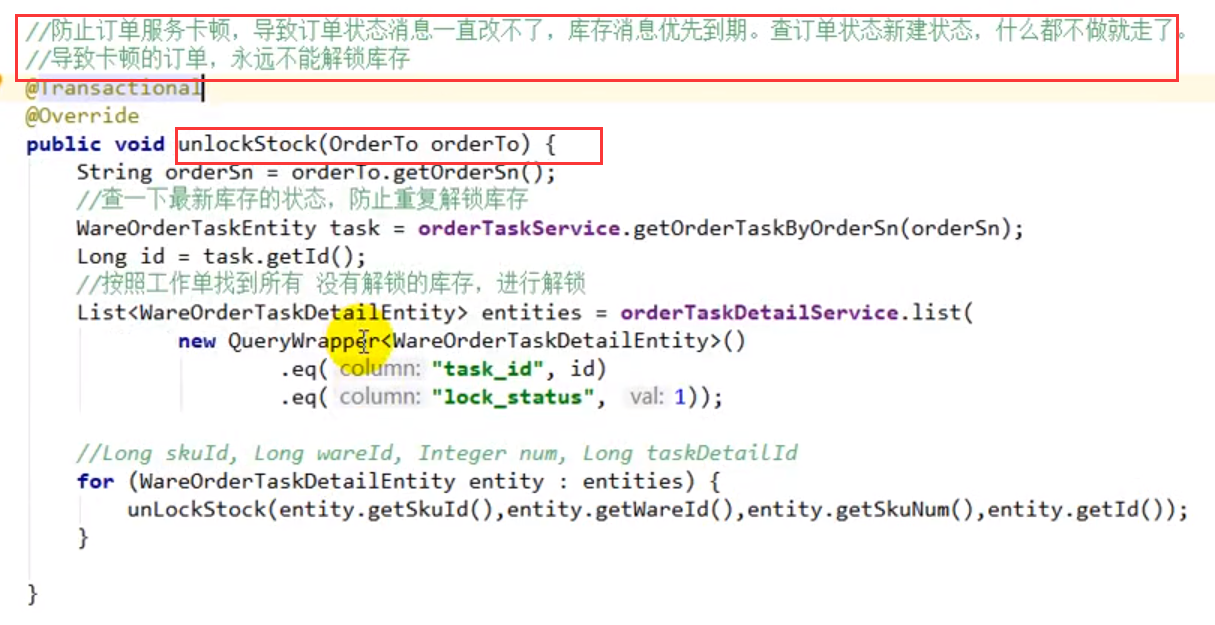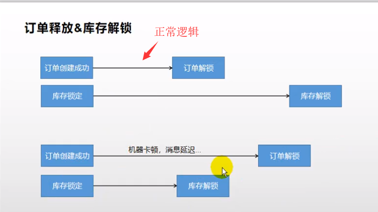 如果发送订单创建成功的那个消息,因为网络,机器卡顿等原因发送慢了。导致解锁库存的消息先被消费,结果发现订单是新建状态,于是是库存就不解锁了,消息也被消费完了。那么一旦上面的那个订单未被支付,库存将永远无法被解锁。