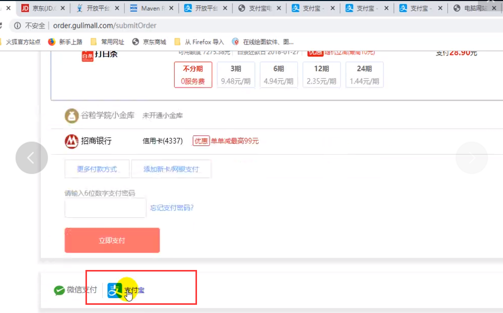 ①订单页点击支付宝进行付款