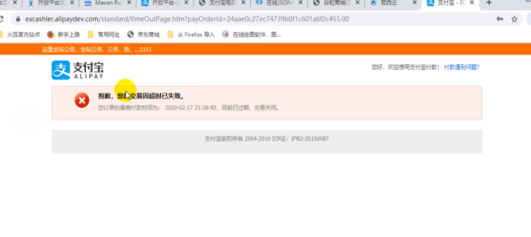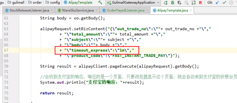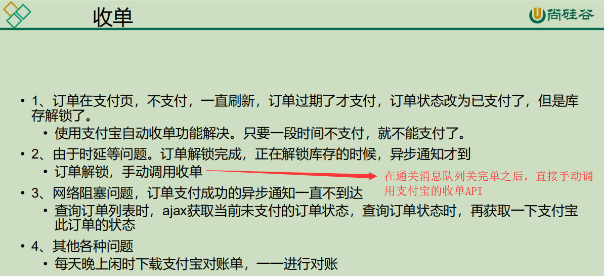 如果我们的订单过期了(根据代码逻辑,订单过期的时候,库存也会马上解锁),支付宝才支付。就有可能造成通过异步回调将订单状态改为已支付,但是库存已经解锁。用户白支付了。所以我们要在支付宝上加上付款时间倒计时。